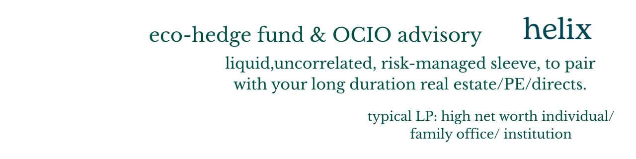 We are a London based highly liquid, eco-hedge fund, that delivers substantial returns, uncorrelated to the market. Our typical LPs use us to manage liquidity and enhance returns on their portfolio of long duration real estate/Private Equity/directs.