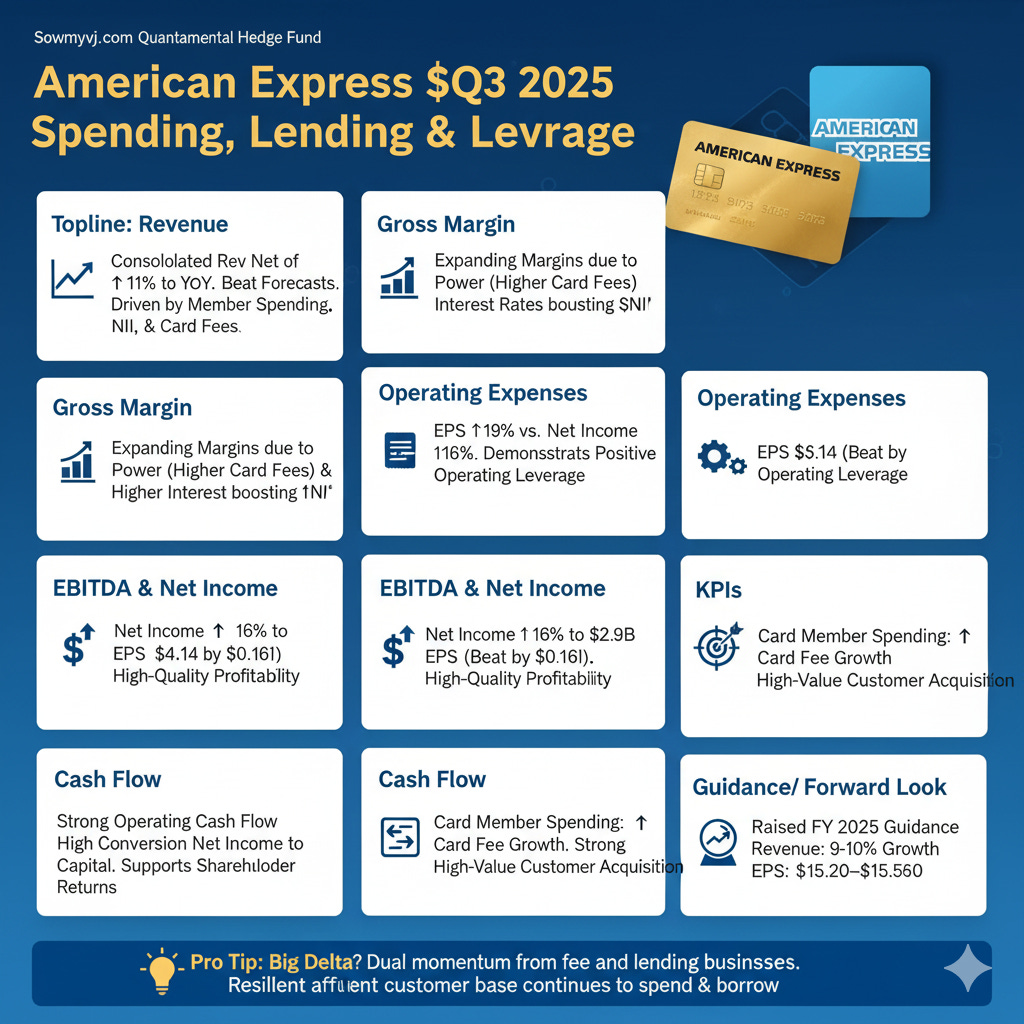 For a quantamental fund like us, American Express’s (AXP) Q3 2025 earnings, released on October 17, 2025, were a textbook example of a premium financial services model excelling in a mixed economic environment. AXP proved that its targeted focus on the affluent consumer segment is a key differentiator, insulating it from the stresses faced by broader financial institutions
