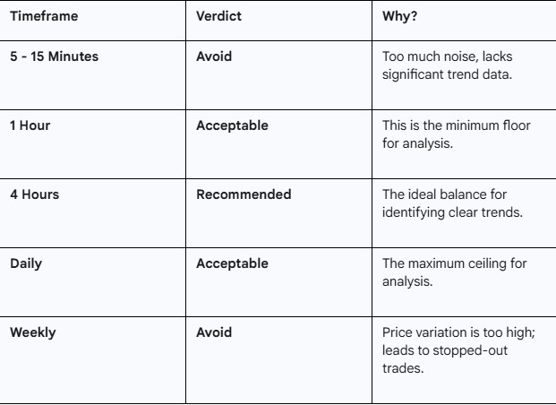 Key Takeaway: If you are analyzing a trade, ensure your chart is set between the 1-hour and Daily settings, with a strong preference for the 4-hour interval.