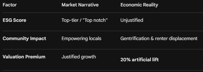 Their business model exists to chase renters out of the market and gentrify your area. When you look at the mechanics, the valuation is 20% higher because of an unjustified ESG rating. If you peel that rating off, the valuation drops massively. That is the reality the market is choosing to ignore.
